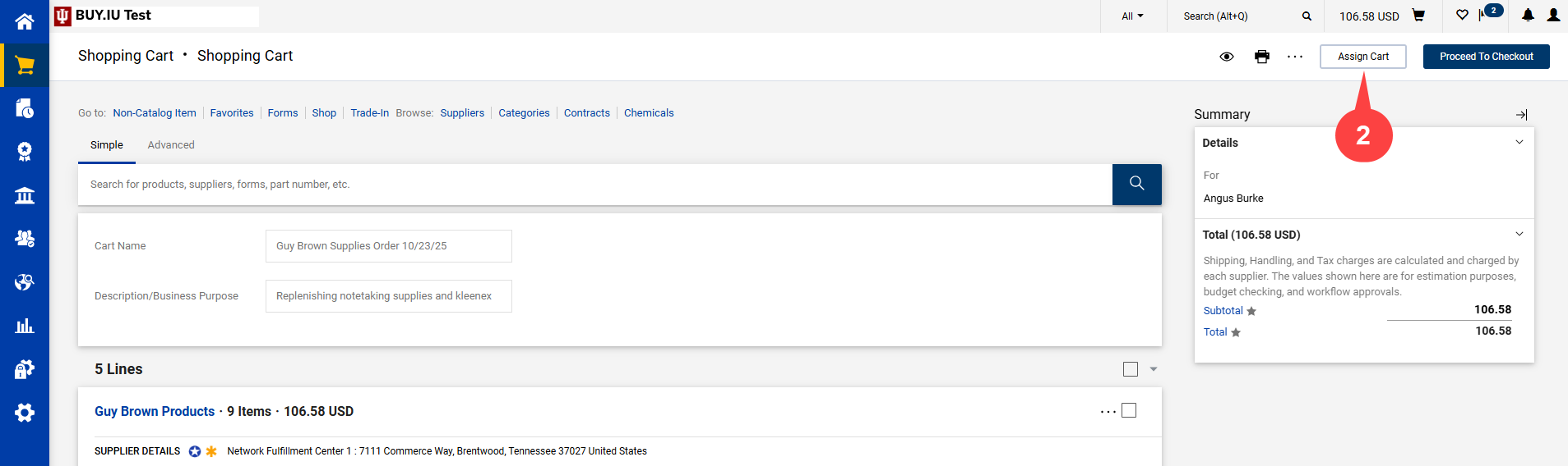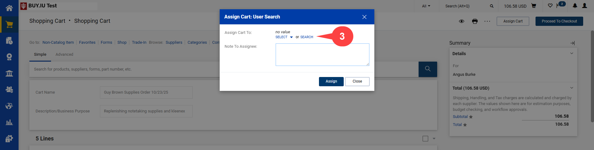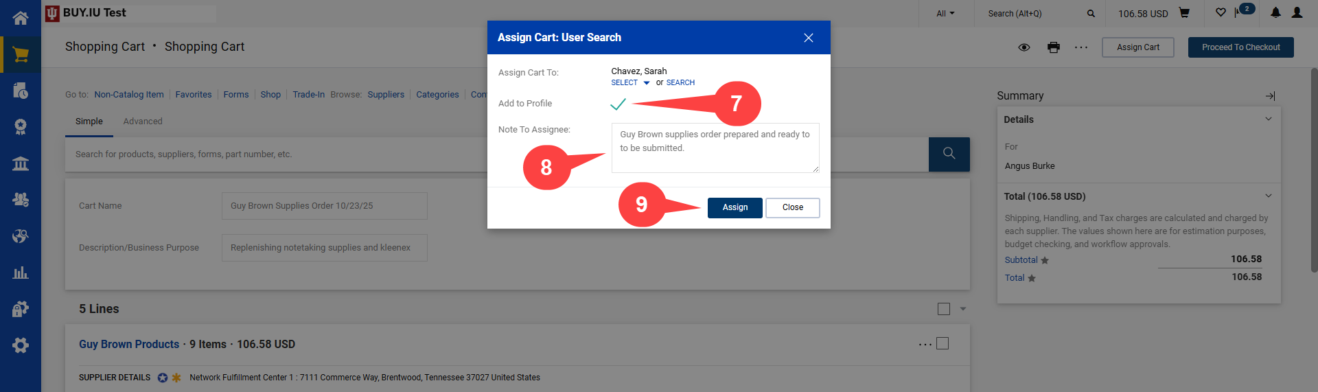 Step 8: In the Note to Assignee field, describe why you are assigning the cart to them. In this example, we entered “Guy Brown supplies order prepared and ready to be submitted.”
