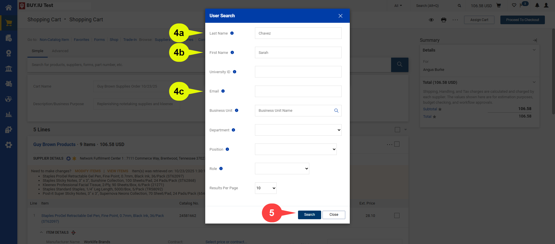 Step 4: The User Search window opens. Search for the person you need to assign the cart to using the following fields. If you are saving the cart for later, enter your information in these fields.