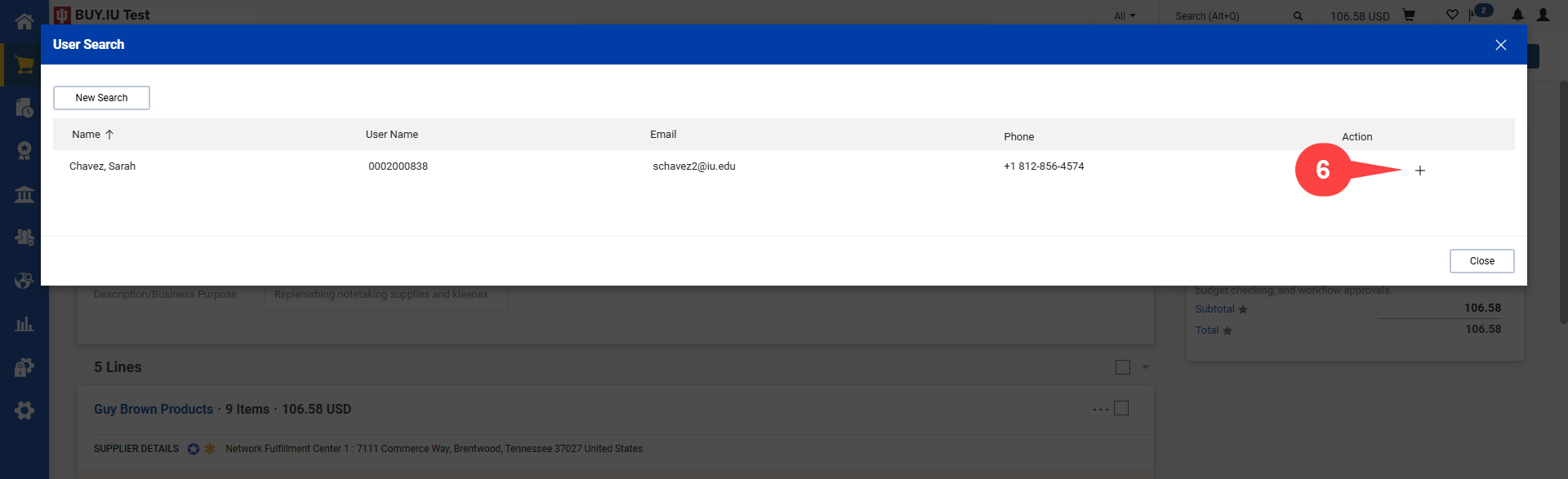 Step 6: The window refreshes with your search results. Click the Plus icon (+) in the Action column for the user you are assigning the cart to.